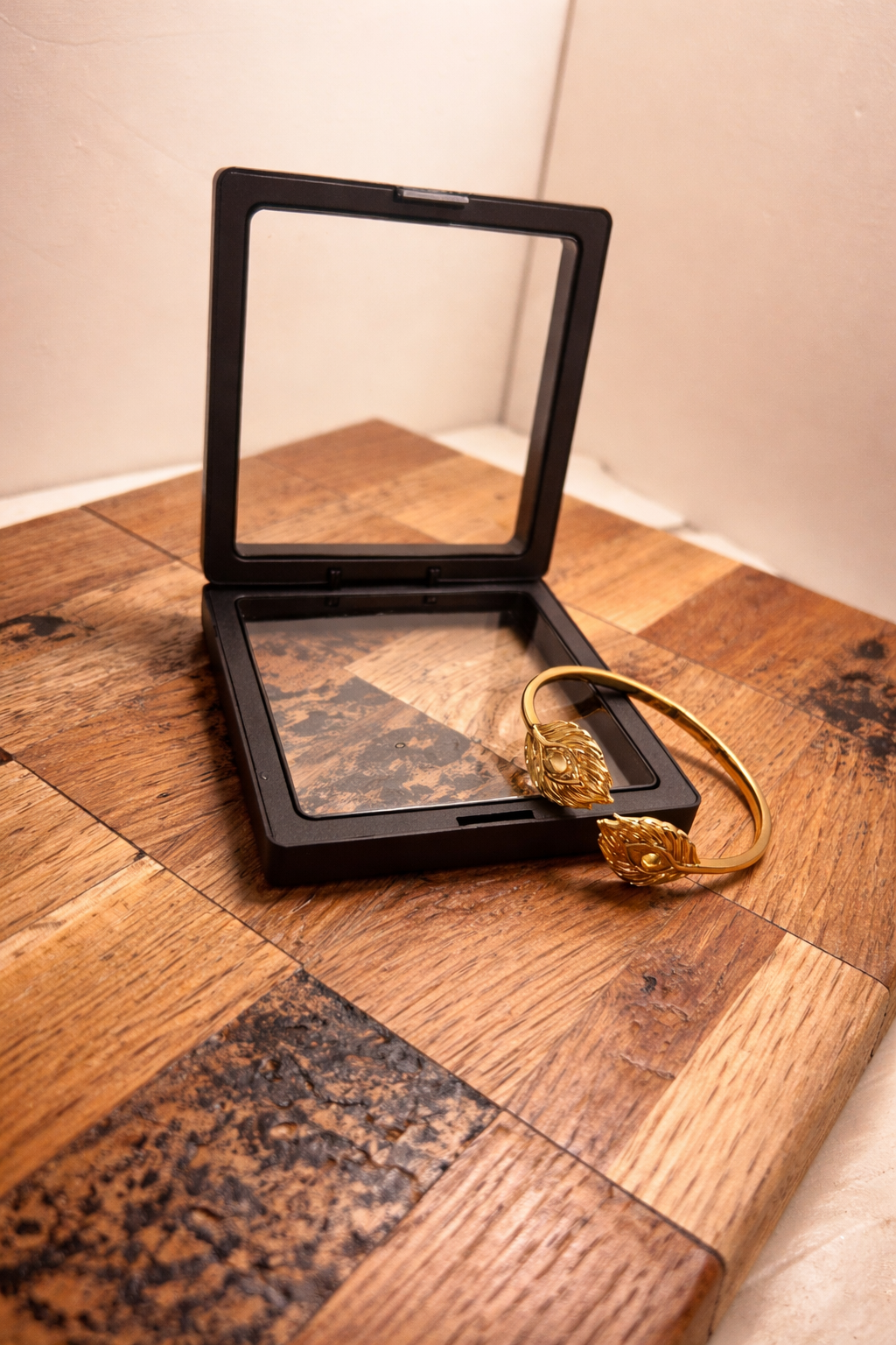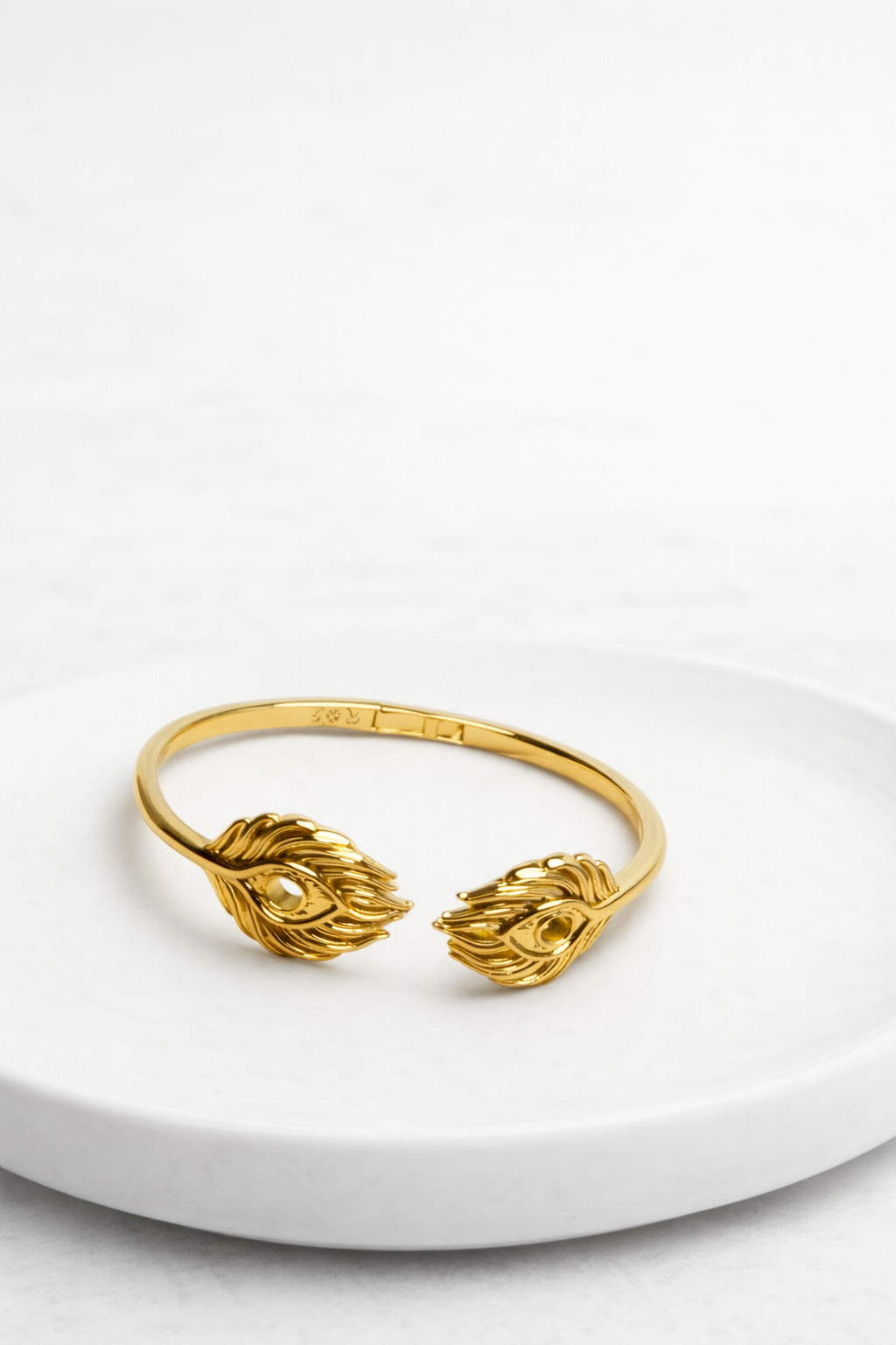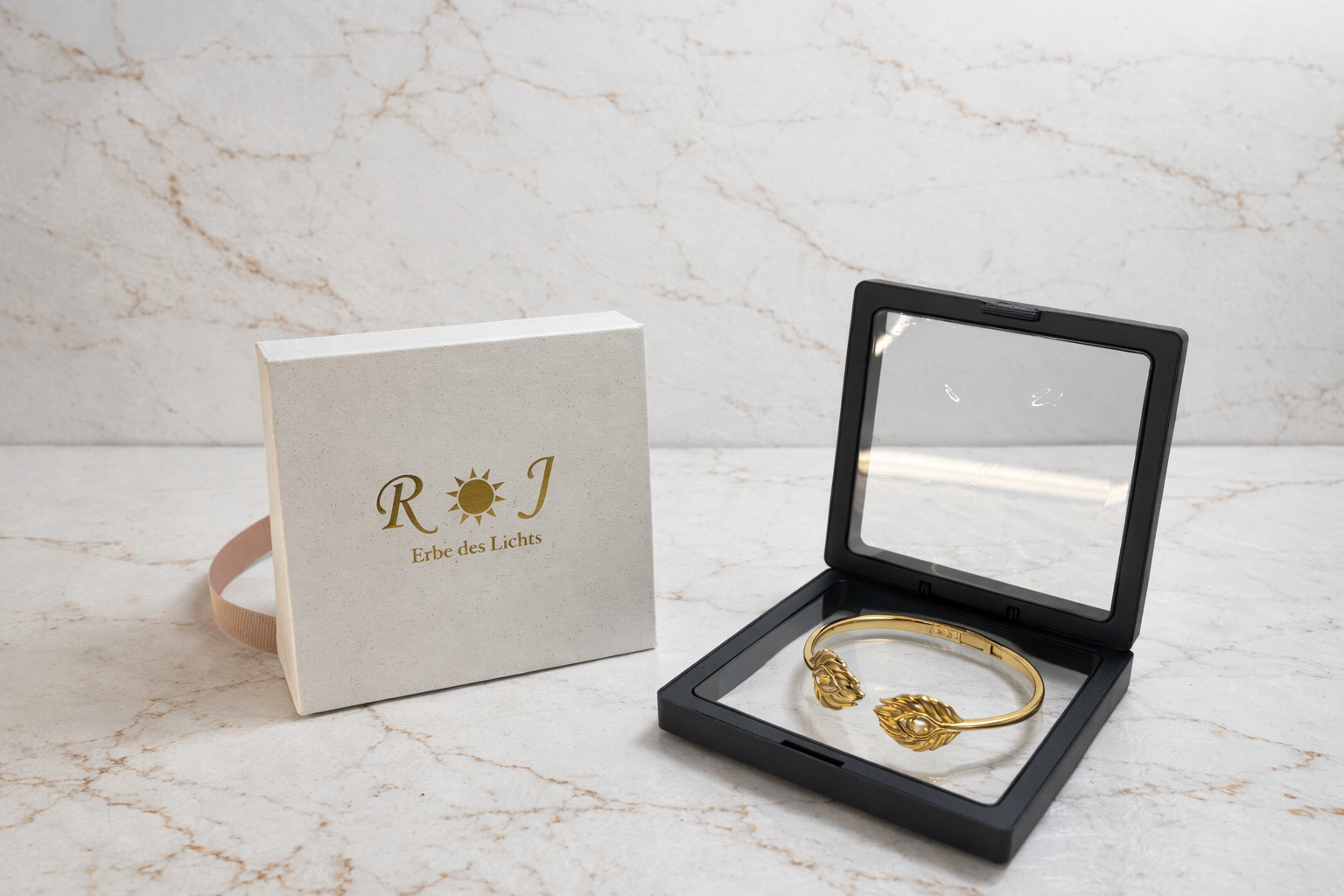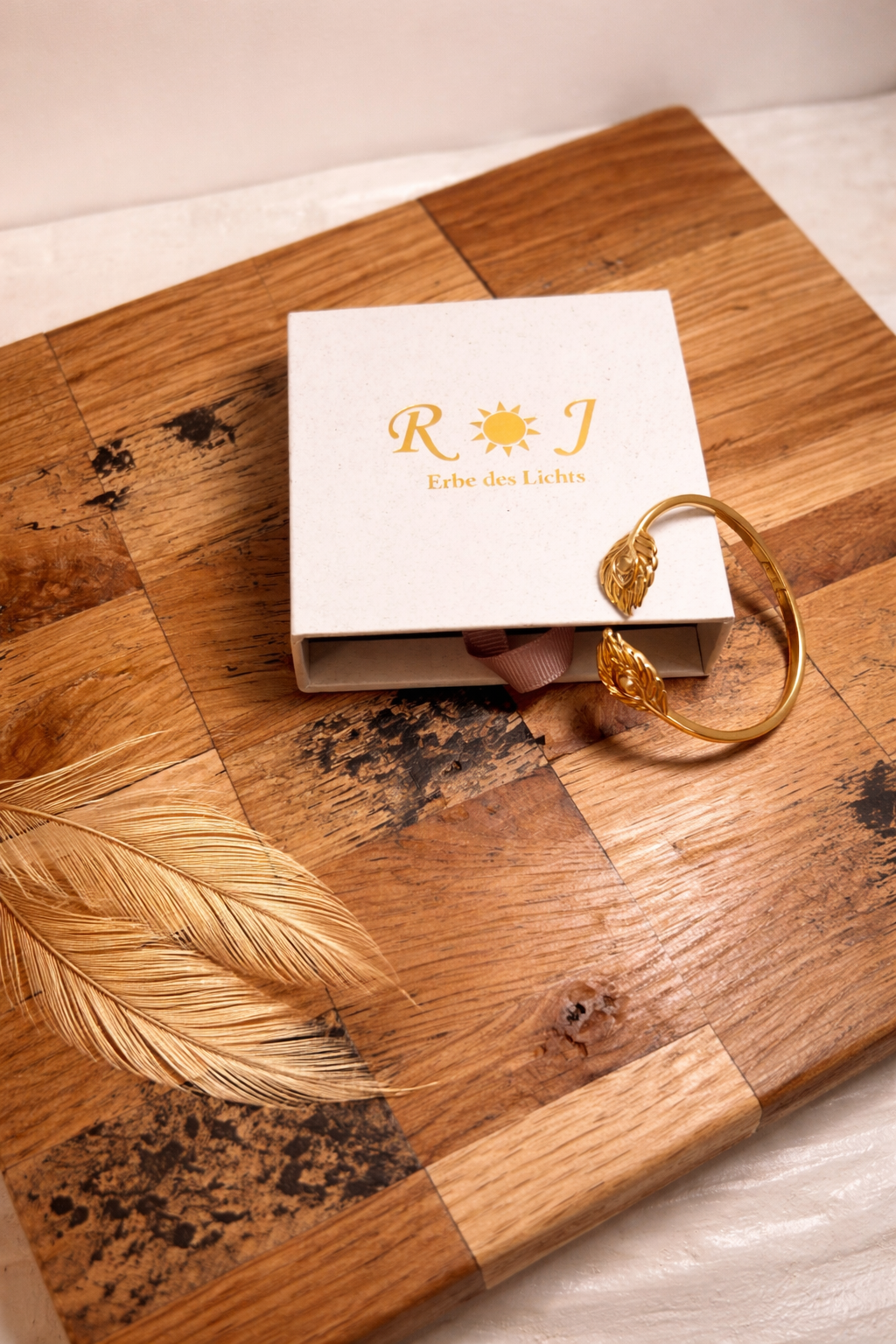 Der Armreif „Auge des Lichts“ ist mehr als ein Schmuckstück – er ist ein Zeichen von Achtsamkeit, Intuition und innerer Stärke. Sein offenes Design endet in zwei kunstvoll gearbeiteten Augenmotiven, inspiriert von der mystischen Symbolik des sehenden Auges und der Pfauenfeder.